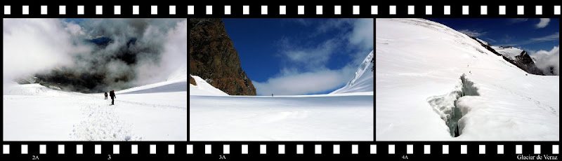 El descenso lo efectuamos por la arista oriental que conducía también hasta la cumbre del Breithorn central, por la que ascendían algunas cordadas. Nosotros no teníamos intención de llegar hasta su cumbre, así que dejamos la huella que seguía para ir a buscar la traza que desde el Breithonrpass llevaba al refugio Guide d’Ayas. El camino que debíamos de seguir cruzaba todo el glaciar de Verra superior por la vertiente sur de la cadena de los Breithorns y la Roccia Nera, pasando por debajo de la isla de rocas donde se encontraba la pequeña cabaña-vivac de Cesare e Giogio Rosso, y delante del Schwarztot hasta alcanzar la base del Pollux, nuestro siguiente desafío y continuaba hasta las cercanias del Zwllingsjoch. Desde aquí descendía al glaciar de Verra inferior donde se encontraba, situado encima de una isla de rocas, el refugio Guide d'Ayas. Aunque era un glaciar muy transitado, había muchas grietas, las huellas del camino rodeaban las mayores, pero no salvaba las mas estrechas que debíamos de saltar, prestando una especial atención al permanente riesgo de caída en una de ellas y vigilando con los pequeños aludes y desprendimientos de seracs que a partir del medio día se iban produciendo.